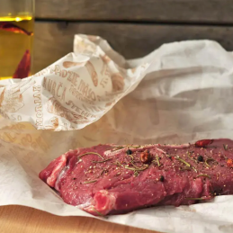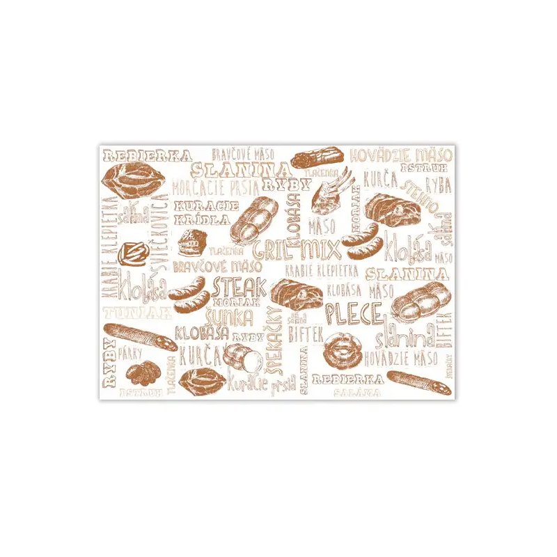 Nepremastitelný baliaci papier: KH PACK® Superior KL40, so stupeň nepremastiteľnosti: KIT 7, 40g/m2 . Potlač: vzor mäso. Vhodný na priame balenie mäsa. Povrchové ošetrenie papiera umožňuje nielen bezpečné zabalenie a premiestnenie potraviny, ale naviac dovoľuje potravinám dýchať. Nedochádza tak k veľmi rýchlemu chuťovému a vzhľadovému znehodnoteniu potraviny.