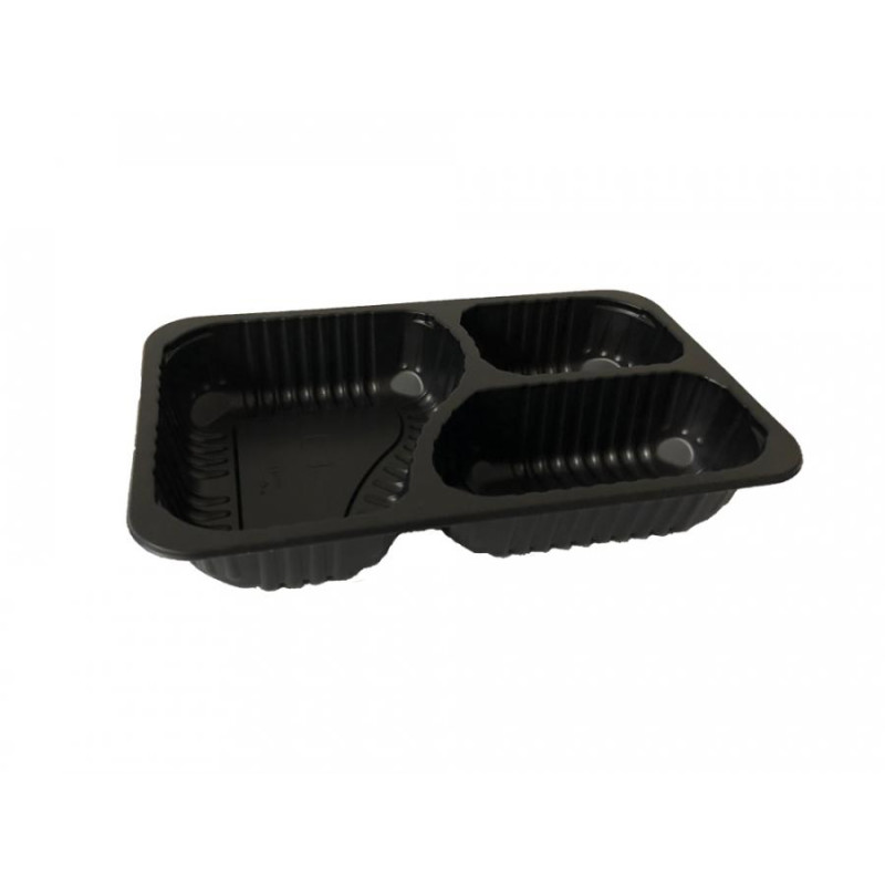 Rozmer vonkajší : 260x158 mm Vnútorná výška : 43,7mm Objem : 800 / 400 ml( po okraj ) Balenie obsahuje : 384 ks Tieto polypropylénové trojdielne misky o rozmere 260x158x43,7mm čiernej farby sú určené hlavne na balenie hotových jedál. Prednosťou misiek je vysoká odolnosť v teplotnom rozsahu od -20 ° C do 100 ° C čo umožňuje baliť práve uvarené pokrmy, následne ich šokovo chladiť alebo mraziť. Ohrev v mikrovlnných rúrach je samozrejmosťou. Vhodné pre zatavovací stroj DF10